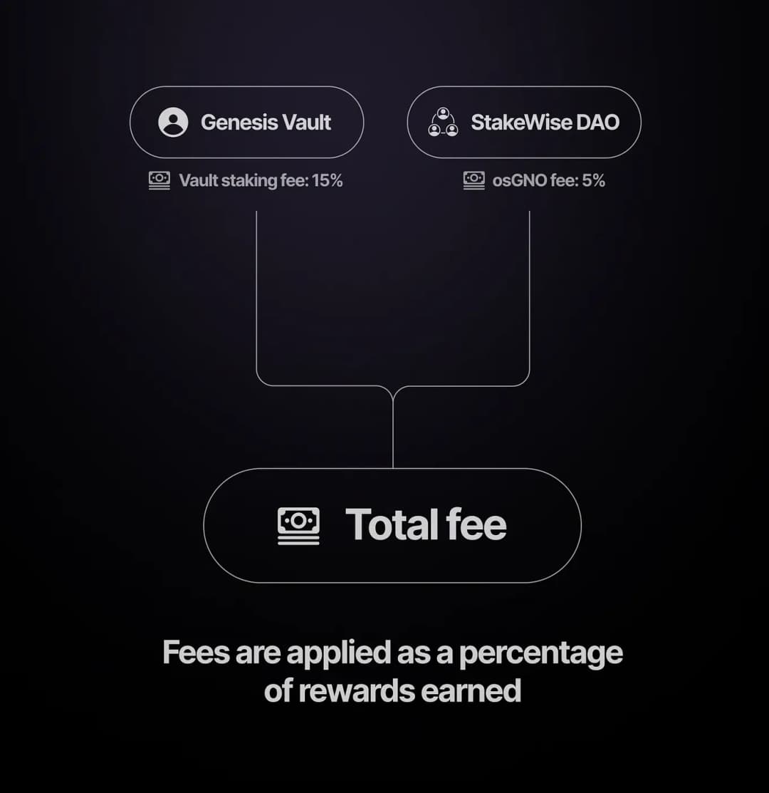 With the advent of StakeWise V3, users pay only the operator fee by default, known as the Vault Fee. It was increased to 15% in the Genesis Vault. A separate fee, known as the osGNO fee, is charged only once users mint osGNO to make their stake liquid. This fee is set to 5% of staking rewards of osGNO and goes to the StakeWise DAO.