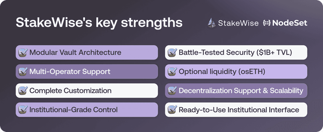 Importantly, a comparable setup is effectively impossible to run elsewhere due to constraints around using a decentralized, multi-operator node network in other protocols. StakeWise Vaults uniquely support this structure without forcing NodeSet into a single-operator model.