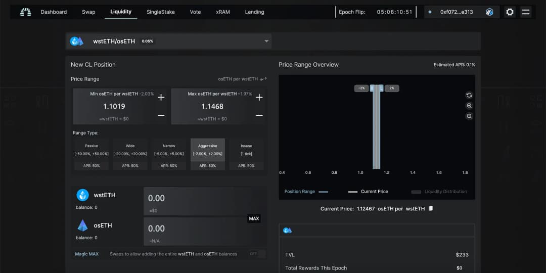 Enter the amount of osETH or wstETH tokens you want to add as liquidity, and the interface will show you how many other tokens you need to deposit. Depending on the price range you choose, Ramses interface will ask you to deposit osETH and wstETH in different proportions of the whole. When choosing the Aggressive Range Type, the value of liquidity between osETH and wstETH (not the unit amount) will be balanced around 55:45 in favour of osETH.