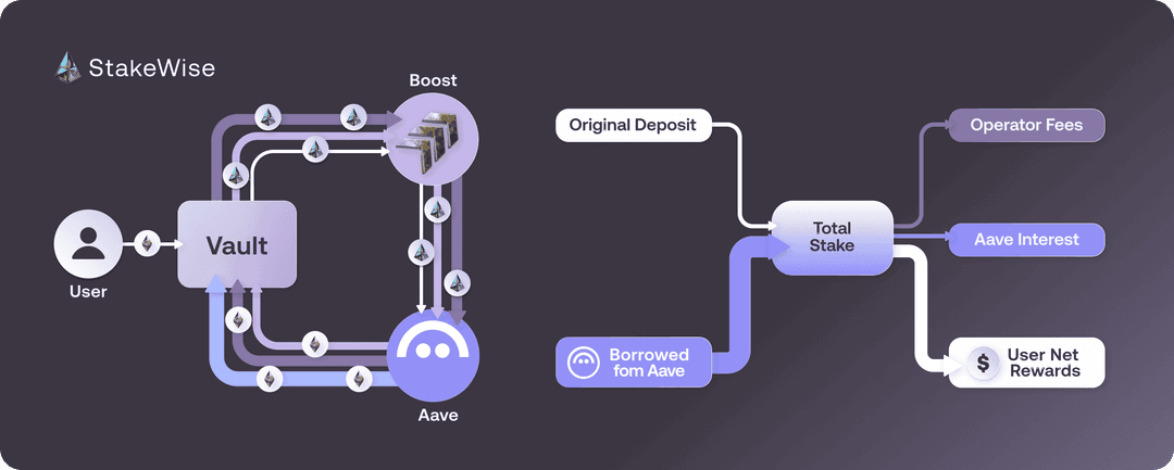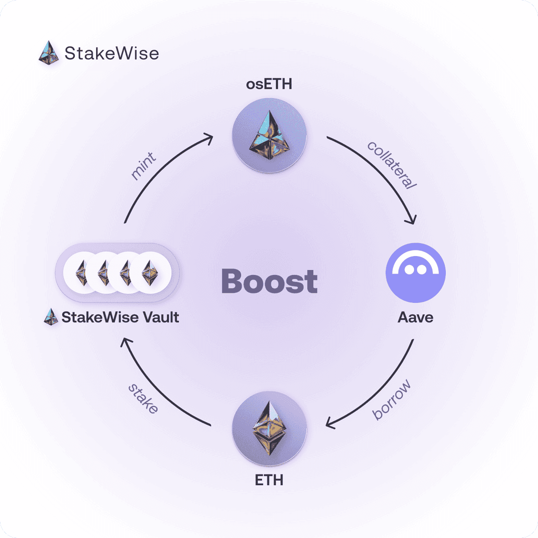 StakeWise Boost is a strategy that enhances traditional ETH staking by using osETH as collateral to borrow additional ETH on Aave. This borrowed ETH is then staked again in StakeWise, creating a “looped” process that is repeated multiple times.