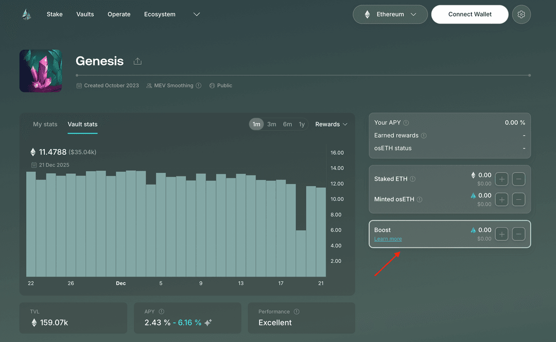Deposit osETH into Boost via the Vault or Stake page. Note that Boosting via the Stake page will allocate additional ETH to the Genesis Vault, even if it’s not the Vault where you originally received osETH from